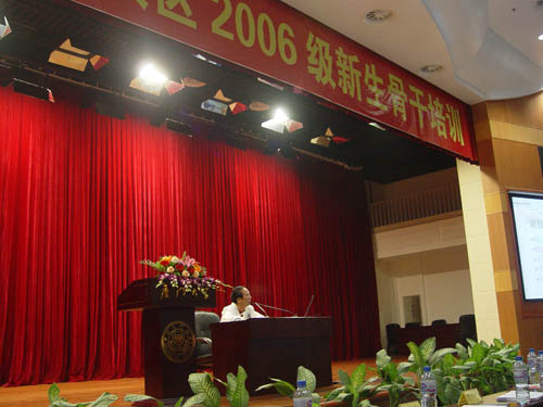 黄如彬在会上讲话。他的发言分为“真诚欢迎同学们对校区工作提意见”、“学生干部要在和同学打成一片中引领同学”、“做一名好学生、好干部是成为合格党员的重要基础”、“学生干部要有意识地培养锻炼自己”等四方面内容。他表示相信,参加学习的2006级新生骨干一定会与校区全体教职工一道,不断提高为广大师生服务的水平,为不断推进和谐校区建设做出自己的贡献。