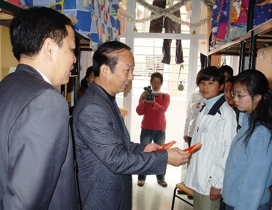 黄如彬每到一个宿舍,都与贫困生亲切唠家常,了解他们的家庭经济状况,关心他们留校期间的学习与生活情况。像父母般叮嘱他们注意安全,照顾好自己,过一个平安、吉祥、充实、愉快的寒假。他亲手将团中央给予的慰问金送到贫困生代表手中,并特别交待留校学生要常往家里去电话,向家人报平安,让家人放心。