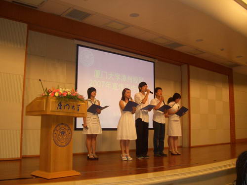 首先,大会揭晓2006年校区“十大新闻事件”。在视频短片的带领下,在场观众们一起回顾了由师生投票推选出的2006年漳州校区“十大新闻事件”,共同见证了过去一年校区取得的成绩和丰富多彩的学习、工作、生活场景。揭晓过程中还穿插播放了评选活动的花絮,校区学生记者站的播音同学还带来了根据2006年校区“十大新闻事件”撰写的诗歌《校区2006,我们所珍爱的句子……》,活动形式活泼多样,赢得了场上的阵阵掌声。