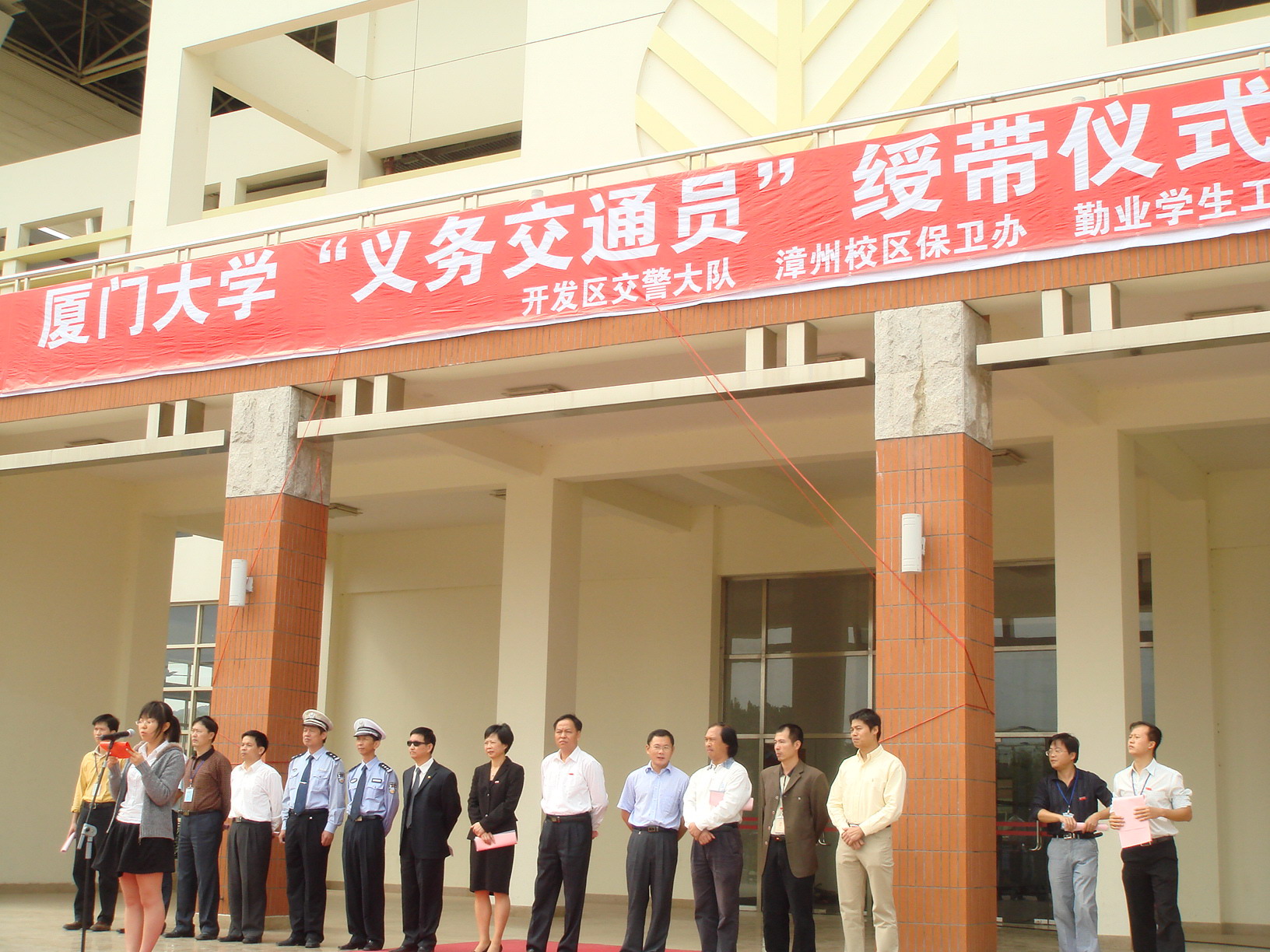 11月8日,漳州校区“义务交通员”绶带仪式在校区体育馆门口隆重举行。招商局漳州开发区党委副书记张逸南,开发区交警大队大队长李劲民、教导员叶建国,校长助理、漳州校区党工委书记、管委会主任王巧萍,漳州校区党工委副书记谢银辉,学生园区党总支书记、学生办主任郑建华以及开发区交警大队中队、校区有关部门、各学生工作站的负责人出席仪式。