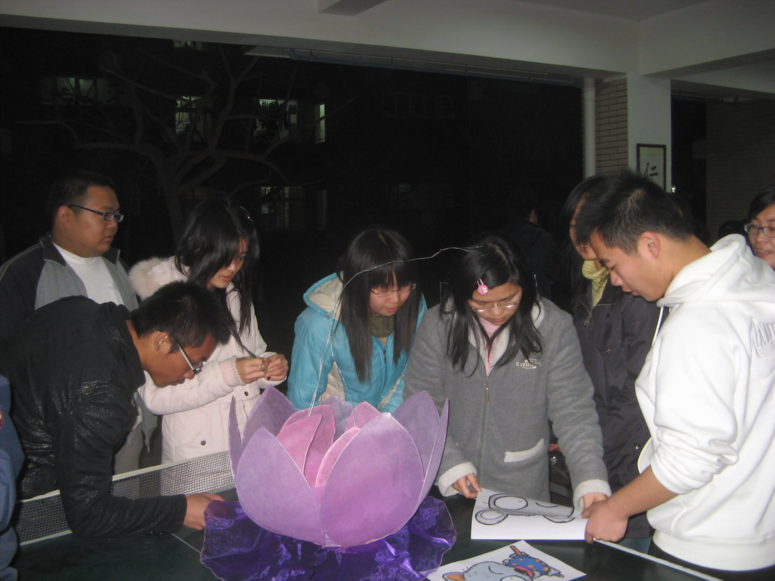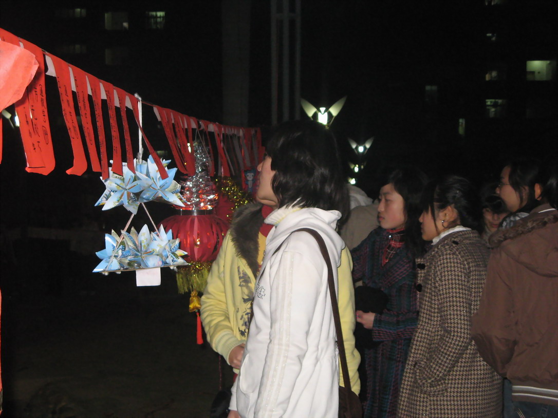 晚上七点,漳州校区北部生活区灯笼闪亮,人头攒动,一百多盏手工制作的灯笼把整个生活区装扮得格外喜庆,舞龙舞狮表演引来观众阵阵掌声,猜灯谜、做游戏逗得人们笑声不断。今年的灯会主要由奥运主题、环保主题、学科专业主题、科技主题、传统主题等五个主题一百多盏灯笼系列组成。同学们亲手制作的灯笼妙趣横生:传统的莲花灯,可爱的福娃灯,奥运五环灯,神州飞船灯,时尚的电脑灯,别致的DNA双螺旋灯,象征鼠年的老鼠灯……各式各样的手工灯笼让人看得眼花缭乱,引得同学们驻足观看,啧啧称赞。同时还有百余条灯谜悬挂于园区各处,同学们漫步于灯火绚烂的园区,开动脑筋,争相竞猜,答对的同学还领取了节日礼品。