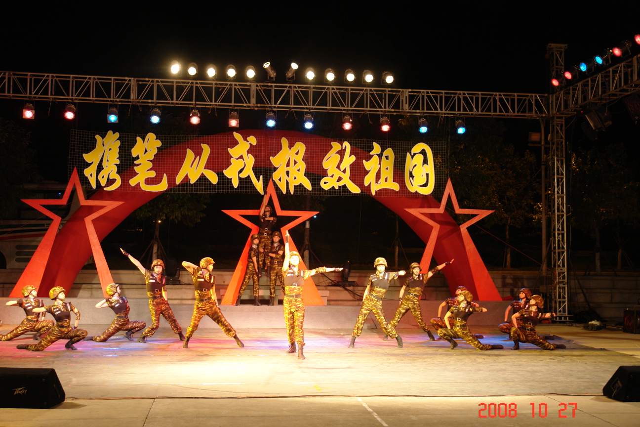 10月27日晚七点,漳州校区北区篮球场被绚丽的舞美灯光、绿色的迷彩海洋所包围,“参军无尚光荣”主题文艺演出暨“携笔从戎、报效祖国”签名仪式在这里举行。
