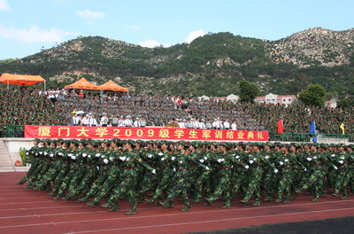 9月26日上午,2009级学生军训结业典礼暨阅兵式在漳州校区田径场隆重举行。中国人民解放军某集团军副参谋长,中国人民解放军某旅旅长,厦门警备区副司令员,中国人民解放军驻厦门大学选培办主任刘和孝,校党委副书记陈力文,校党委副书记、副校长、学生军训工作领导小组组长辜芳昭,副校长李建发、赖虹凯,校长助理、漳州校区党工委书记、管委会主任、学生军训工作领导小组常务副组长王巧萍,嘉庚学院院长王瑞芳,常务副书记、副院长鲁同安,校军训领导小组成员,机关部处负责人、学院党政领导,漳州校区各单位、各部门负责人,承训部队官兵,全体军训带队教师和参训新生参加了结业典礼。漳州校区党工委副书记、学生军训工作领导小组副组长梁卫中主持典礼。