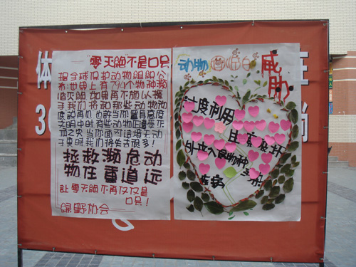 近日来,不少同学发现在映雪与囊萤宿舍楼之间的绿化带展出了大量动物图片。包括大熊猫、羊驼、蓝鲸、微型猪、麋鹿等在内的十余种动物的图片在春风中飘动,与草地的绿色相映成趣。但看到其中的描述文字时却又顿感惋惜。诸如在对东北虎的介绍中则说,目前“我国境内野生东北虎数量不足20只,而世界范围内也仅有400只左右”。这样直观而感性的数字瞬时触动了大家的心弦,也让同学们印象深刻,自然达到“提供动物保护,宣传相关知识”的活动目的。