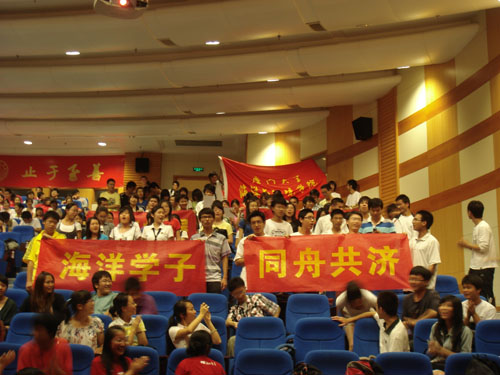 中场休息的拉歌环节一下子将气氛推向了高潮。国际关系学院同学深情演唱了《我的中国心》,软件学院同学则带来了《龙的传人》,新闻传播学院以一曲《走进新时代》博得现场的热烈掌声,管理学院同学整齐高亢地唱响《希望的田野上》,数学科学学院同学借一首经典的《歌唱祖国》感染了每一位观众,最后的海洋与环境学院同学以男女对唱的方式精彩演绎了《爱我中华》。在场的同学反响热烈,高潮迭起,也很好的缓解台上选手的紧张情绪。