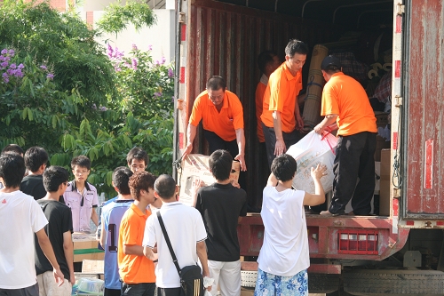24日上午一大早,最早搬迁的物理与机电工程学院、外文学院和生命科学学院的同学们,在老师的指导下、在09级学弟学妹的帮助下,有条不紊地进行行李搬运和装车。7:30第一辆搬迁行李车按计划驶出校区,8:20第一艘专船搭载着回迁的同学从漳州港发往厦门。