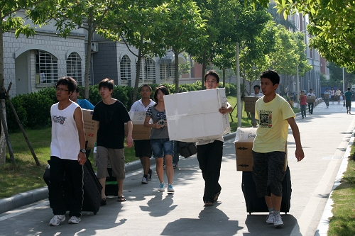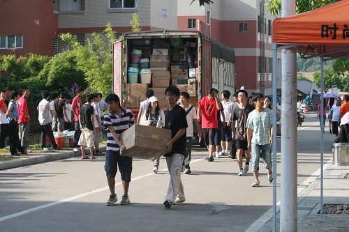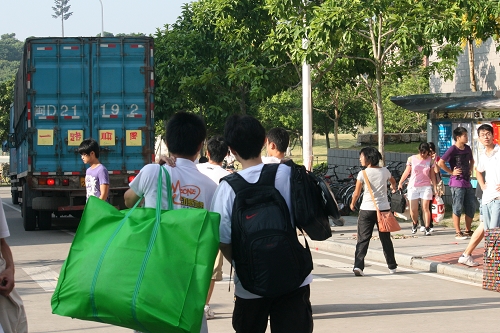 7月24日上午,我校2008级本科生回迁校本部工作正式展开,约5300名同学和他们的行李将在两天时间搬迁回校本部。