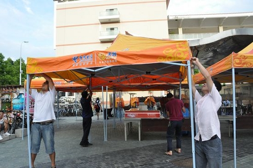 9月9日、10日上午,校区的步行广场和附近道路上陆续搭起了迎新用的帐篷架,校区各主要公共场所、各个园区门口挂上了醒目的迎新标语、横幅、彩旗和气球。10日下午2时许,志愿者们提前到岗,做好了充分准备,迎新工作进入倒计时。