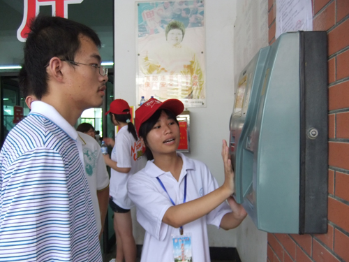 在校区银行,一批青协志愿者们正在为来自天津的家长韩先生解答一些关于校区的问题。迎新的这几天,来银行存取现金和办理各种业务的新生和家长络绎不绝。除了负责维持银行的秩序之外,青协志愿者们还要解答新生和家长各式各样的问题,甚至包括厕所在哪里这样的问题他们也会一一给予解答。“他们的服务态度非常好,给了我很大的帮助!”韩先生感激地说。
