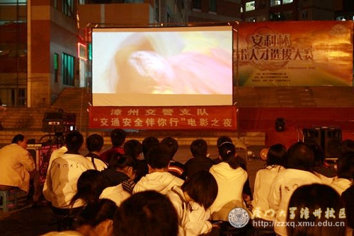 11月30日晚,由漳州市交警支队、漳州开发区交警大队主办、漳州校区管委会协办的“交通安全伴你行”电影之夜活动在校区北区步行广场举行。本次活动旨在加强广大师生的交通安全意识,创建平安和谐的校园环境。出席活动的领导及来宾有:漳州校区管委会副主任黄田、开发区交警大队郑国强和各学院辅导员。别开生面的电影放映吸引了200余人前来观看。
