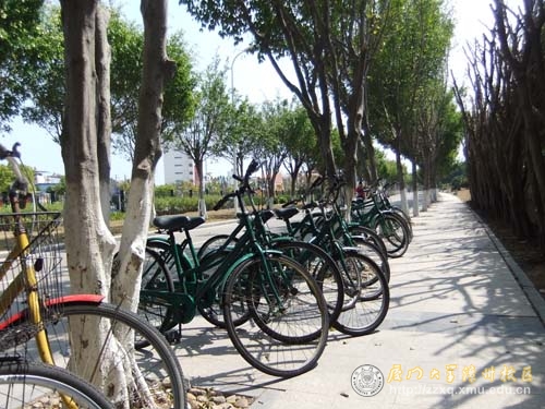 从2010年上学期开始,经过改造的700多辆绿色出现在校区的各个角落,成为方便同学们在校区内使用的交通工具。从散落于在教学校、园区,影响美观的废车到穿行于校园里,人见人爱的“绿宝”。这些自行车实现了华丽的转身,同学们往来于校区各场所变得更加方便和从容。