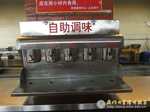 以往食堂调味台上的调味品都是零散陈设的,在使用时会散落在台面或相互混杂。新的调味台则将每种调味品用固定的容器盛放,通过阀门控制从小孔流出,不易混合或与空气发生反应,并且定期更换,保证调味品的新鲜。
