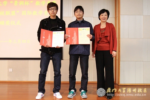 3月4日晚,我校2010年度“景润杯”数学竞赛暨第二届“八校联盟”国际数学竞赛颁奖仪式在漳州校区主楼一楼报告厅举行。副校长邬大光教授,校长助理、漳州校区党工委书记、管委会王巧萍主任,教务处处长谭绍滨教授,国际合作与交流处毛通文处长,数学科学学院院长林亚南教授,漳州校区管委会黄田副主任等领导出席颁奖仪式。颁奖仪式由教务处副处长、漳州校区教务办主任谢火木主持。