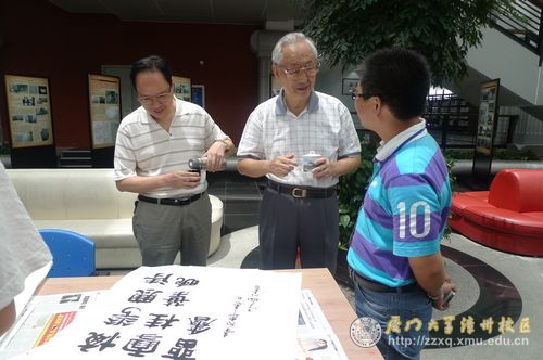 7月1日上午,由漳州校区图书馆与我校老年大学书画研究院共同举办的“庆祝建党90周年书画笔会”在漳州校区图书馆三楼中庭与师生见面,引起强烈反响。来自我校老年大学书画研究院的吴宣恭、周济、林跃华、邱松庆、黄琪玲等13位老同志,在现场挥毫波墨,留下一幅幅生动传神的画作和书法作品。活动现场引来许多书画爱好者相互切磋技艺,交流气氛热烈。