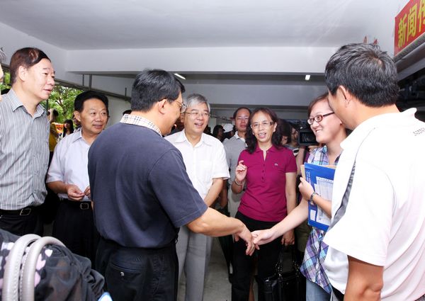 31日上午,朱之文一行冒着风雨沿嘉庚学院迎新路线一路察看,并不时就新生住宿、餐饮、交通、安保等情况询问工作人员。在南安园区迎新点的新闻传播系报到处,一名新生刚报到完毕,朱之文便热情地迎了上去,亲切地与其交谈,询问报到是否顺利、还存在什么困难等。