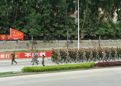 在快到达校区北门时,同学们又打起精神,在教官的带领下大声地喊出口号,唱起《团结就是力量》,早在北门迎接的校领导们和大二的同学们也情不自禁地为他们鼓掌。