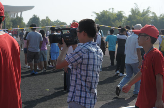 在炎炎烈日下,负责摄影摄像的同学要扛着沉重的机器在各个运动项目比赛场地间穿梭,在为运动员捕捉一个个精彩瞬间的同时,汗水也湿透了他们的衣衫。