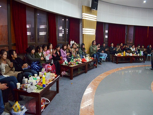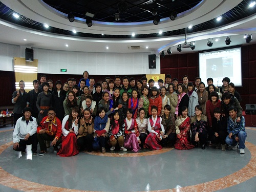 晚会在“锅庄”舞中进入高潮,这是藏族的民间舞蹈,在节日或者农闲时跳,舞者围成圆圈,自右向左边歌边舞。现场所有的师生观众都参与其中,气氛十分欢悦。晚九时,晚会结束后,全体师生合影留念。
