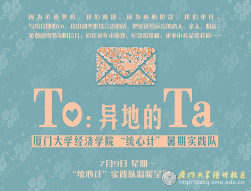 7月9日中午,经济学院“统心计”实践队精心策划的“写给异地的他&她”校内宣传活动在漳州校区北区步行广场火热举行。同学们纷纷在明信片上为远方的亲朋好友写上祝福,表达对亲情、友情、爱情的感动。