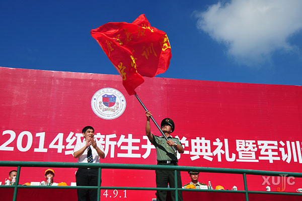在军训工作领导小组副组长杨飞宣读军训团机构编成后,军训工作领导小组组长张必华向军训团授旗,为期14天的军训正式拉开序幕。
