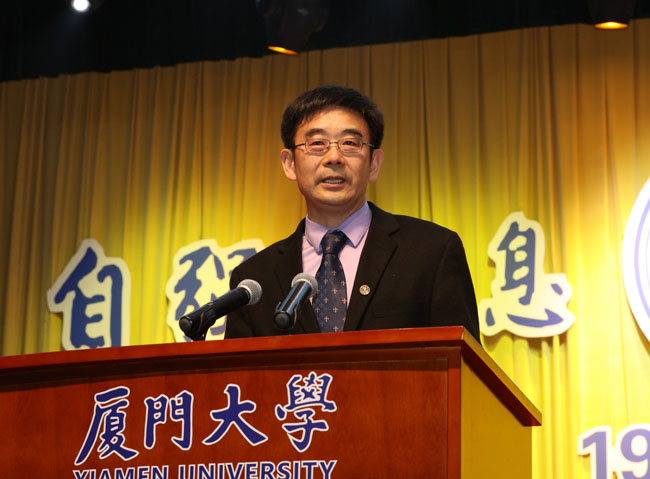 教师代表、海洋与地球学院戴民汉代表全体教师祝母校生日快乐。他说,厦门大学,是塑造我人生的起点,我在这里收获了知识和成长,厦门大学,赋予了我施展抱负的舞台,我在这里收获了事业与幸福。他特别提到了“嘉庚号”海洋科考船的建设,说,当年,嘉庚先生要让所有的外国洋轮一进厦门湾就能看到一所中国的大学,今天,随着“嘉庚号”海洋科考船的建成,从此世界上就有了一所“移动厦大”、“海上厦大”,这是厦大、厦大海洋学科对陈嘉庚先生的一份感恩,一份回馈。
