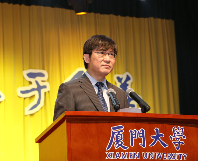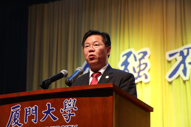 福建省原副省长、省人大常委会原副主任、河仁慈善基金会理事长曹德淦代表全体捐赠者祝贺厦门大学建校95周年。他表示,企业的发展,需要创新引领,科技和人才是关键,高校在其中发挥着重要作用。企业和高校,应当携手同行,优势互补,为服务国家创新驱动发展战略和地方经济社会发展作出更大贡献。