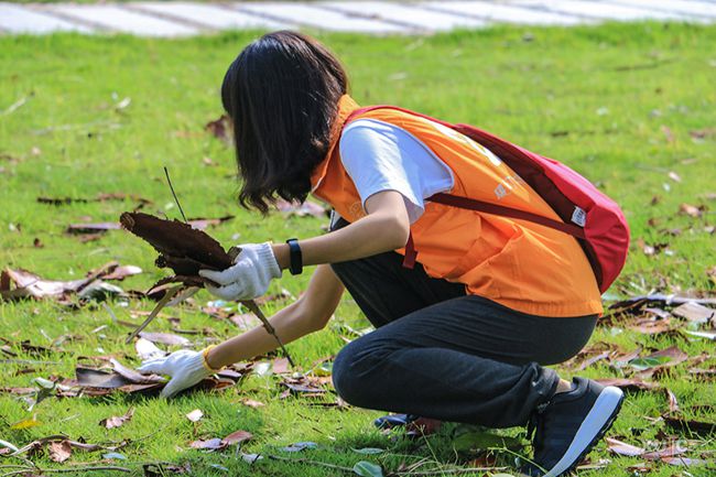 志愿者不停地弯腰、下蹲、站起,把落叶和枯枝堆成了一个个小堆