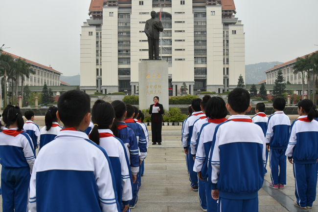96周年校庆前夕,厦门大学附属实验小学的师生代表齐聚在南强广场陈嘉庚先生铜像前,深切缅怀校主陈嘉庚先生。