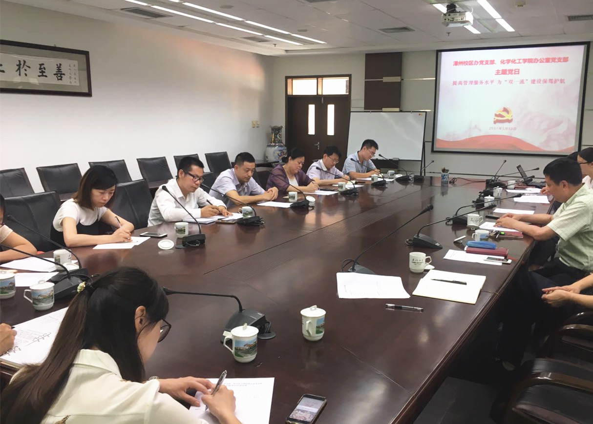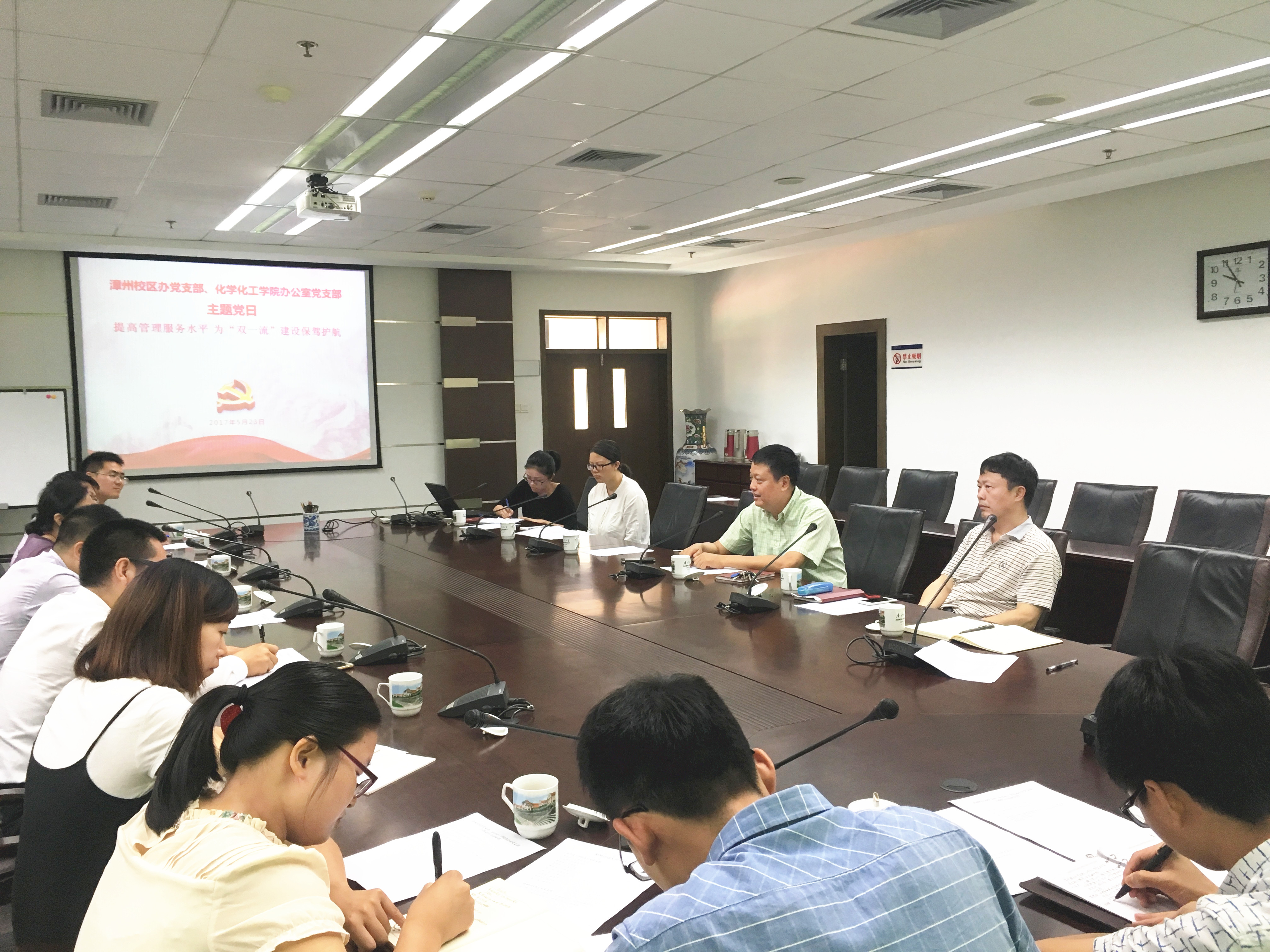 5月23日上午,漳州校区办公室党支部与化学化工学院办公室党支部在漳州校区联合开展了“提高服务水平 为‘双一流’建设保驾护航”主题党日活动。活动由校区办党支部书记邱媛主持。
