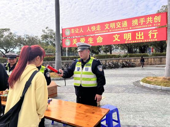 12月2日,校区邀请漳州开发区交警大队民警到校,利用中午时间段,与保卫部门在南强广场开展现场宣传。活动包括演示各种不同常见食品饮料包含酒精情况,汽车和遇两轮车的“开门杀”事故,交通执法摩托车等,并进行发放宣传活页、答疑解惑等活动,向师生们普及交通法规和安全常识,强调了遵守交通规则的重要性。