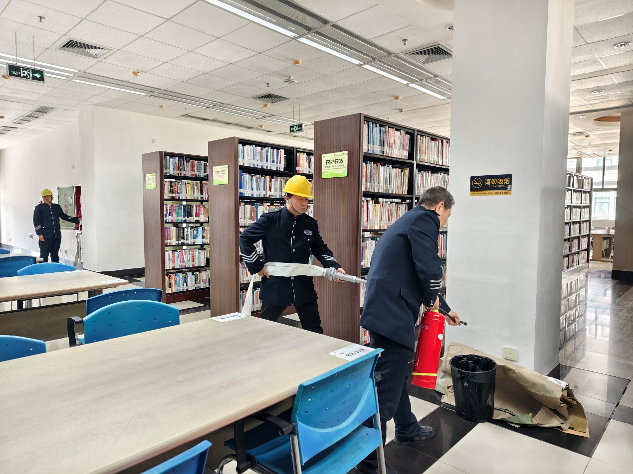 演练活动以图书馆二楼阅览室某处产生明火为背景。“火情”发生后,图书馆管理人员启动消防应急处置预案,物业工作人员迅速利用室内灭火栓和灭火器扑救初起火,图书馆工作人员有序疏散学生,学校微型消防站接到火警后,就近的微型消防站队员在三分钟内到达起火点,采取有效措施成功将火扑灭。