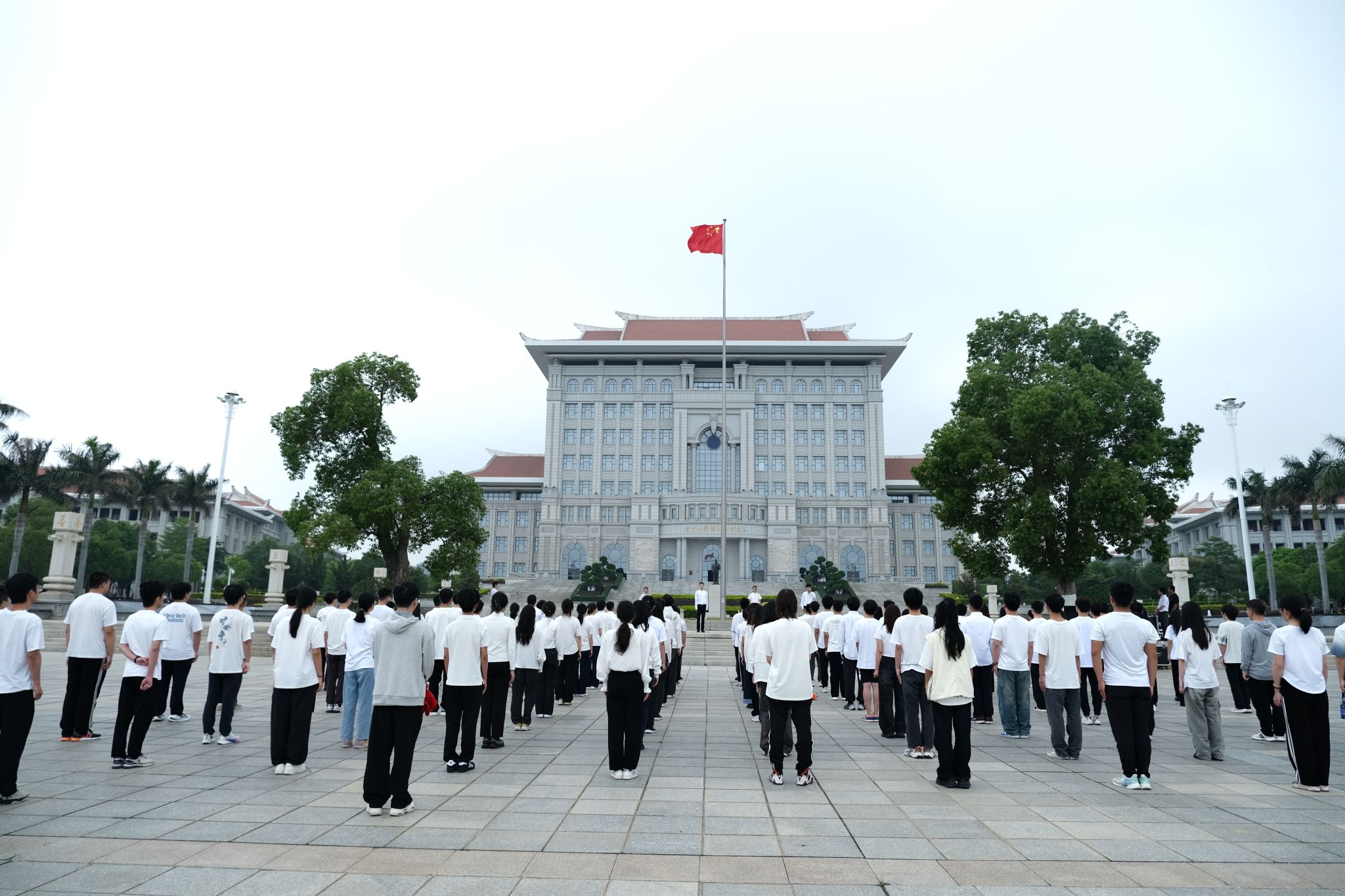 在思明校区,200余名师生齐聚嘉庚广场,一同参加升旗仪式。迎着清晨的曙光,国旗班旗手们精神昂扬、步伐整齐,护送着五星红旗正步走向升旗台。雄壮激昂的国歌奏响,鲜艳的五星红旗在师生的注目中冉冉升起,庄严而隆重。