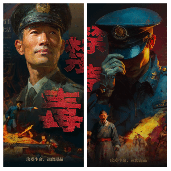 《承先贤志,警护安康》系列作品紧扣禁毒核心,深度融入林则徐虎门销烟的精神象征,以视觉艺术为桥梁,串联起禁毒历史与当下使命。作品一中,禁毒警察执帽肃立的深沉构图,搭配冷暖光影的强烈对峙,既重现了林则徐精神的庄严底色,又彰显了当代禁毒工作者的理性与坚毅,唤醒青年对禁毒历史的敬畏之心;作品二则以裂纹书法笔触的象征性表达,隐喻毒品带来的社会创伤,更传递出正义冲破黑暗、守护无毒青春的坚定信念,完美诠释了新时代青年对禁毒使命的传承与担当。