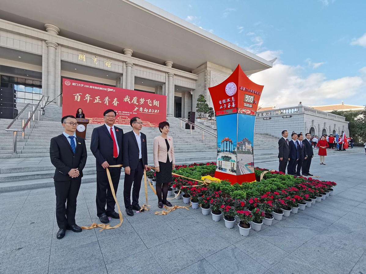 在翔安校区,校长助理、翔安校区党工委书记、管委会主任陈光与师生、校友代表、附属单位代表共同为倒计时牌揭幕,校区领导向4月6日出生的师生赠送纪念品,全体师生齐唱校歌。随后,在“奔向2021,迎百年校庆助跑”环节中,由国旗护卫队组成的方阵、由优秀教师代表参与的自行车方阵、由2021名师生代表组成的方阵环校区主楼群助跑。