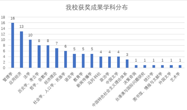 从各单位获奖情况来看,人文学院最多,共有23项成果获奖;经济学院第二,20项成果获奖;管理学院第三,12项成果获奖。另法学院9项成果获奖;马克思主义学院7项成果获奖;教育研究院6项成果获奖;新闻学院、公共事务学院、社会与人类学院各5项成果获奖;王亚南经济研究院与台湾研究院各3项成果获奖;海外教育学院2项成果获奖;外文学院、建筑与土木工程学院、公共政策研究院与南海研究院各1项成果获奖。从学科分布情况来看,本次获奖成果涉及20个学科,获奖成果所属学科前三位分别是管理学、应用经济和法学。从获奖成果的形式来看,以论文为主,有58项获奖成果为论文,44项为专著,还有2项为调查报告、咨询报告。