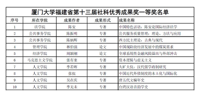 此次我校申报总数为158项,获奖率为65.82%,其中,一等奖10项,占相应奖总数50%;二等奖31项,占相应奖总数44.2%;三等奖54项,占相应奖总数36%;青年佳作奖9项,占相应奖总数30%,获奖总数高居全省第一。我校获得一等奖的分别是人文学院李若晖教授、张侃教授、吴在庆教授、李无未教授,公共事务学院陈振明教授、陈炳辉教授,经济学院周颖刚教授,管理学院林伯强教授,法学院陈安教授,马克思主义学院张有奎教授。