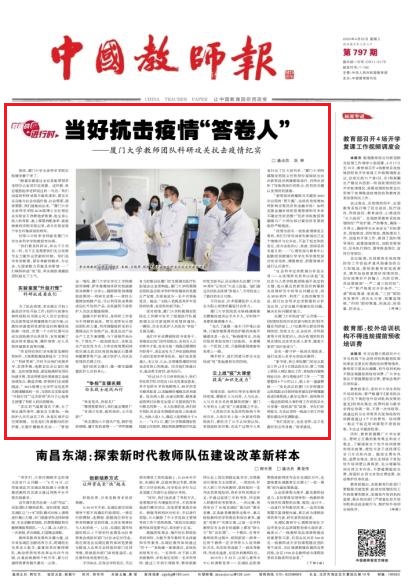 4月22日《中国教师报》头版头条刊发题为《教师战“疫”进行时 当好抗击疫情“答卷人”——厦门大学教师团队科研攻关抗击疫情纪实》的深度通讯。报道从“实验室里‘升级打怪’,科研抗疫看我们”“‘争抢’支援名额,白衣战士逆风而行”“云上战‘疫’大课堂,提高‘知识免疫力’”三个层次,生动展现了我校教师团队科研攻关抗击疫情的情况。
