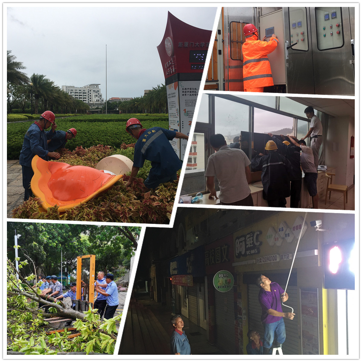 会后,相关职能部门迅速行动起来,以实际行动应对“米克拉”的到来:修订防洪防台风应急预案,形成排涝、水电保障、道路应急清障、房屋及构筑物应急抢修、危旧住宅人员转移多个小预案;成立多支工作组,组建抢险救灾队伍,整装待发,连夜待命;联合厦门市有关单位进行防洪排涝演练和检查测试,确保设备正常运转;开展供电、供水、通信设施设备检查,保证全校安全稳定的供水供电通信;备好沙袋、抽水泵等防涝材料和设备;深入学生宿舍并通过各类平台向师生发布台风动态和台风防范信息,提醒师生做好自我防护;帮助危旧住宅人员加固门窗,适时安排人员转移。