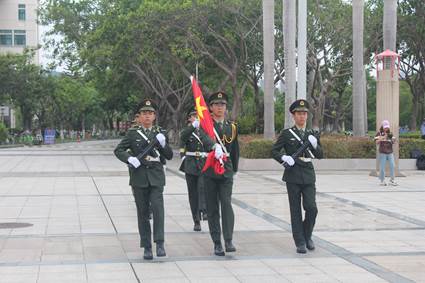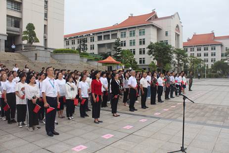 上午8时,在铿锵有力、整齐划一的脚步声中,鲜艳的五星红旗在国旗护卫队的护送下来到升旗台前。国歌奏起,全体师生庄严肃立,面向五星红旗高唱国歌。