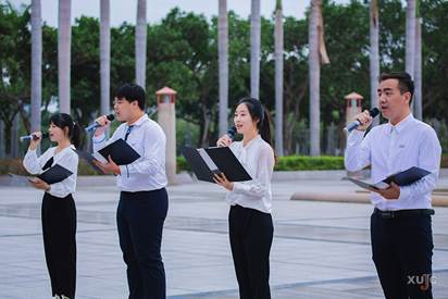 随后,由创意与创新学院2020级视觉传达专业的张银芝、国际学院2020级时尚管理专业的王牛乾元、嘉庚学院2019级物流管理专业的王抒涵以及产业技术研究院和古雷石化研究院课题组的曾泽鹏等4名同学共同深情朗诵了散文诗《我的祖国》,回顾新中国七十一载波澜壮阔的历程,表达对党和祖国无限的热爱和祝福。
