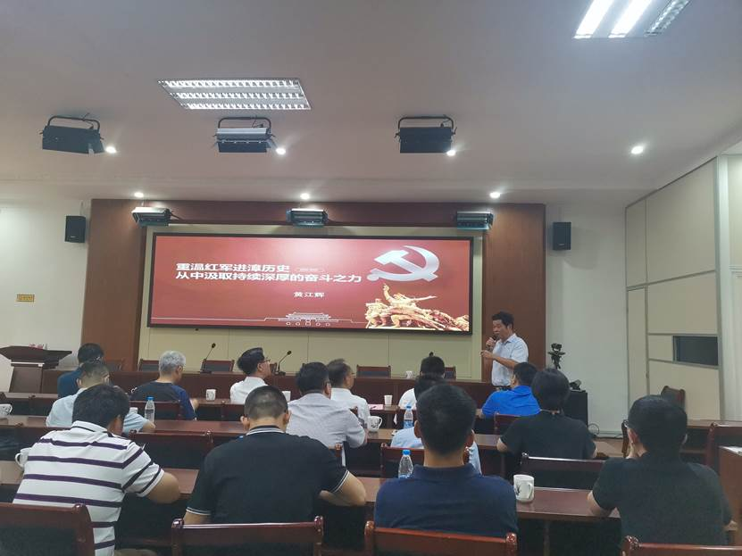 大家在“攻克漳州纪念碑”、毛主席率领红军攻克漳州纪念馆瞻仰学习。纪念馆讲解员介绍了中国工农红军一、五军团组成的东路军从长汀出发,挥师南下,占领龙岩城,在漳州郊区天宝镇经过风霜岭、十字岭等战役的激烈战斗过程。大家在这里认真聆听讲解员的解说,仔细观看陈列在馆内的闽南地区革命活动与红军攻克漳州图片史料、实物资料,以及毛主席当年的工作生活用品,缅怀红军战士们的光辉业绩和卓越功勋。中共漳州市委教育工委书记、漳州市教育局党组书记、局长黄江辉同志以《重温红军进漳历史,从中汲取持续深厚的奋斗之力》为题,为大家讲了一堂专题党课。