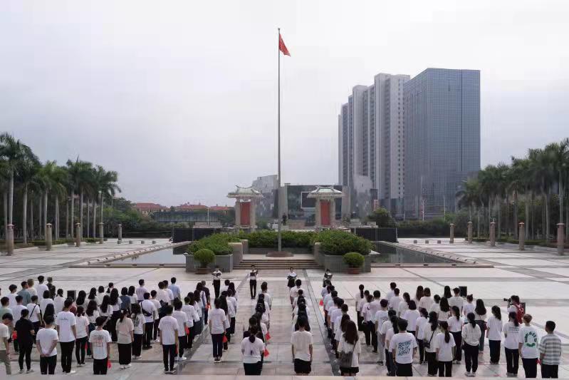 升旗仪式结束后,大家举起手中的五星红旗,在朝阳中合影留念。