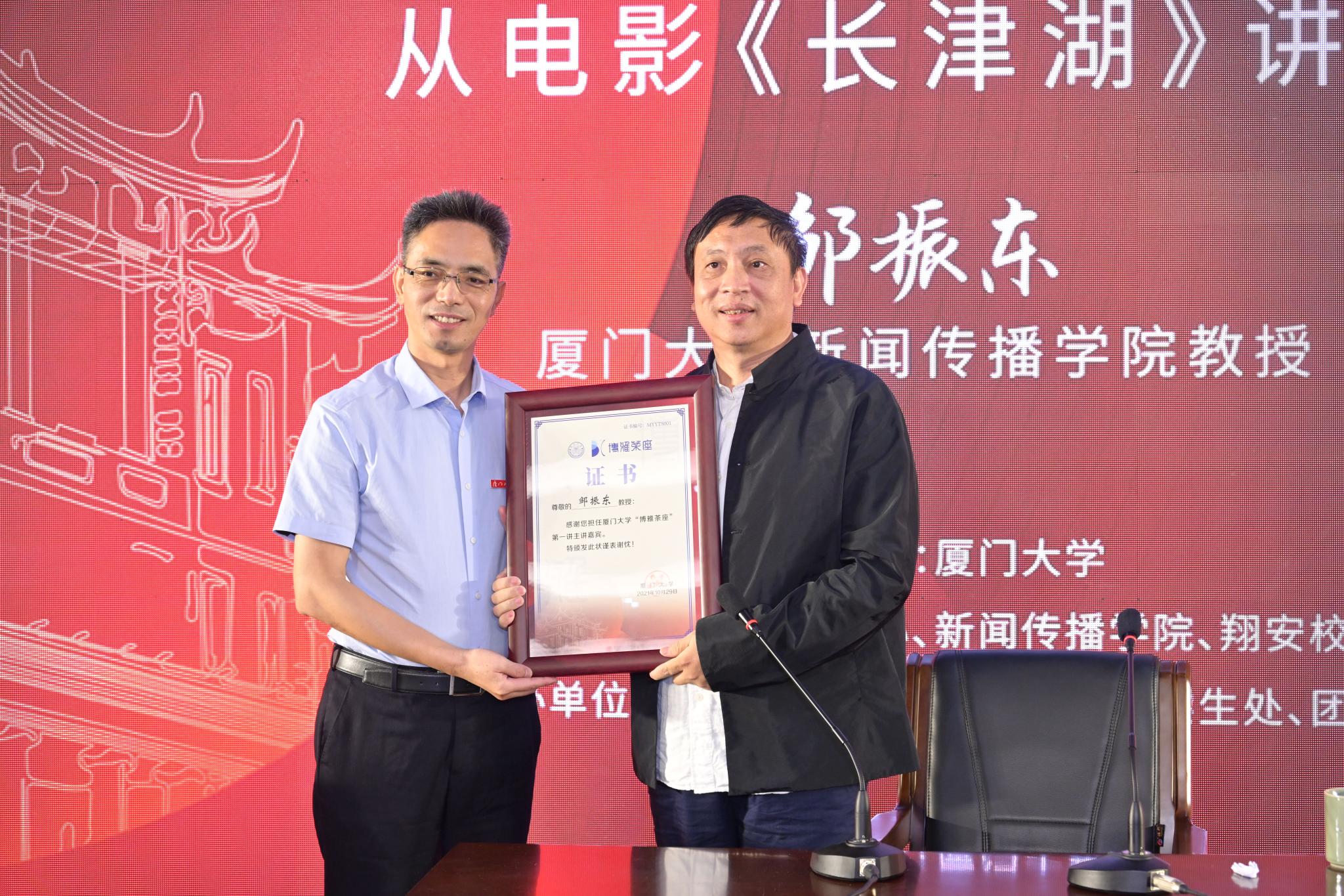 揭牌仪式后,厦门大学首场“博雅茶座”开讲。新闻传播学院教授邹振东教授应邀作为讲座嘉宾,作题为《电影里的传播学——从电影<长津湖>讲起》的精彩讲座。副校长周大旺为邹振东颁发纪念牌。