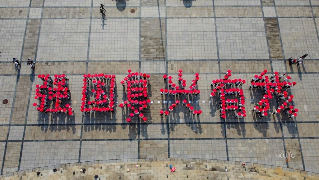 在活动正式开始前,来自校区各院系270个同学手持红色卡纸,共同摆出“强国复兴有我”的方阵造型。
