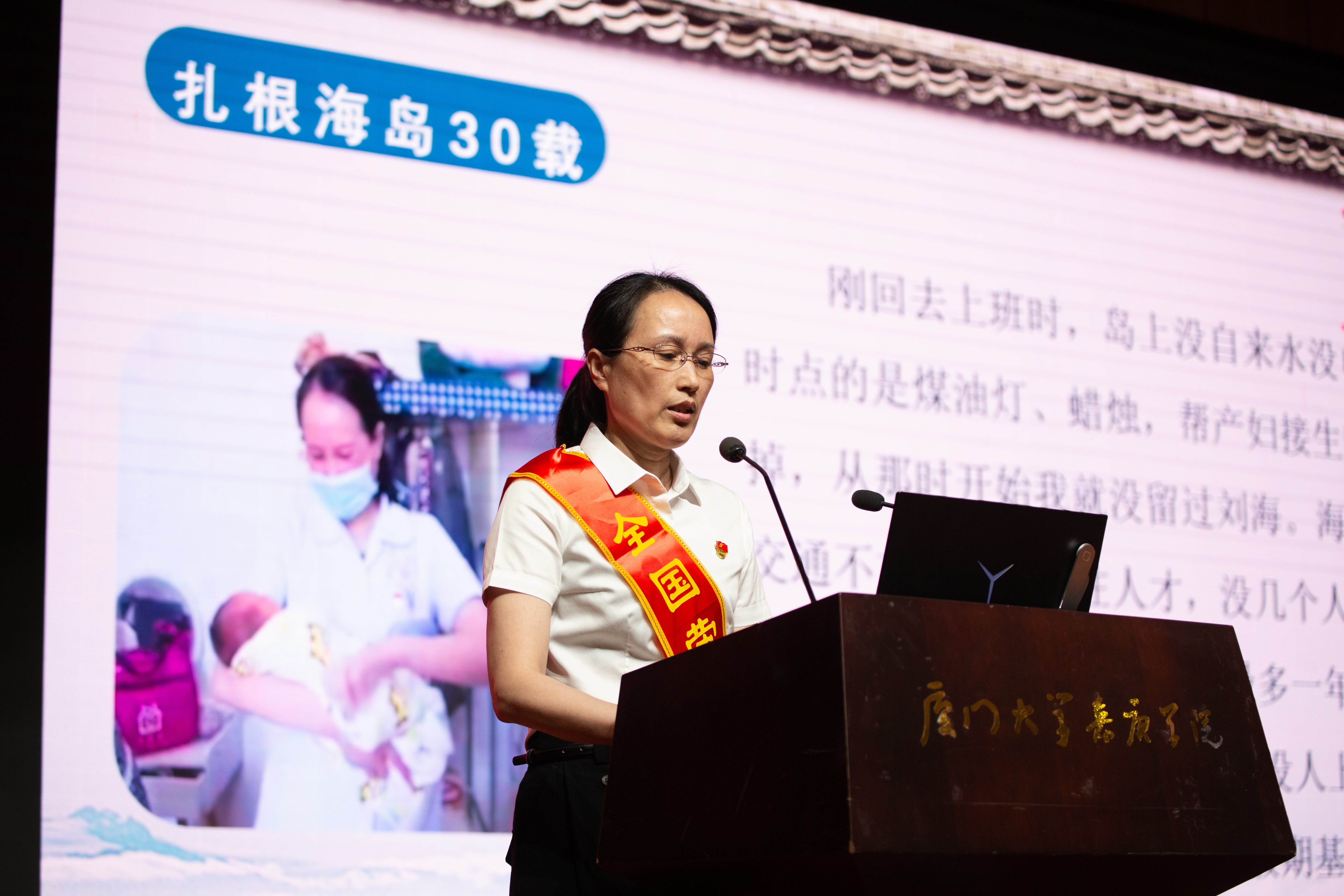 “一心为民三十载,芳华绽放在海岛”——魏德英扎根海岛33年,无论抢救、手术、接生、出岛转诊,还是疫情防控、公益活动,她都义无反顾地站在第一线,用自己的坚守、责任和担当为海岛卫生健康事业奉献一份力量。因为南日岛交通不便,医疗条件极差、人手极度稀缺,魏德英需要经常上夜班,最多的一年,她上了200多天夜班。在33个寒暑中,她接生了6000多名婴儿。因为地理位置的特殊,遇到一些紧急情况时,医务工作者需要护送产妇出岛就医。有时候遇到大风天,医务工作者也要冒着危险出岛就医,因此他们也被称为岛民“守护神”。2019年,她被中国妇幼保健协会评为“坚守产房三十年资深助产士”。2020年,她被评为全国劳动模范。分享的最后,她坚定地说:“我会把对党和人民的忠诚和热爱牢记在心目中、落实在行动上,一心为民,立足本职,爱岗奉献,砥砺前行,为卫生健康事业发展作出更大的贡献。”