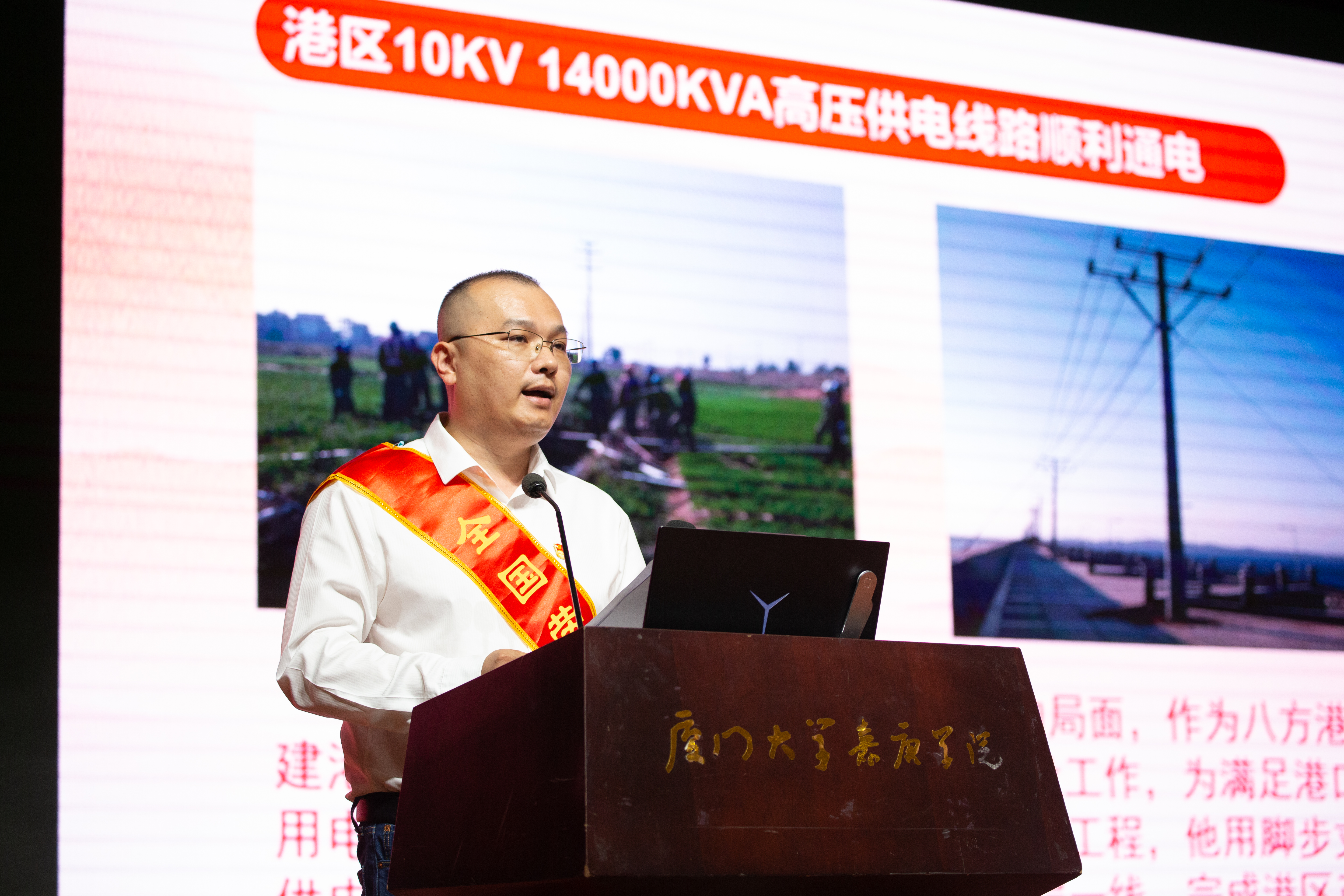“勇担港口使命,奋进时代征程”——连俊分享了他在工作中的创新故事和心路历程。2010年,他入职福建八方港口发展有限公司,在工作中,他从人才培养和技术创新项目两个方面贯彻落实省委“深学争优、敢为争先、实干争效”的行动部署,积极创建“连俊劳模工作室”和省级“示范性劳模工作室”,带领工作室团队累计完成一百多项技术革新项目(其中多个项目荣获“福建省劳模工作室优秀创新成果”奖和“福建省企业职代会优秀提案”奖),累计完成技能培训三十余次,培训技术员工四百多人次。凭着精湛的专业技术,他先后荣获“省重点建设项目先进工作者”“省五一劳动奖章”“省劳动模范”“全国劳动模范”等荣誉称号。作为校友,在喜迎嘉庚学院20周年校庆之际,他祝愿母校赓续校主陈嘉庚的爱国精神,培养出更多有理想、敢担当、能吃苦、肯奋斗的新时代好青年。