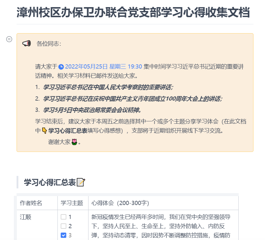 支部其他党员围绕学习内容、结合工作实际,就当前新冠肺炎疫情防控形势的认识,以及如何进一步做好校区疫情防控工作分享心得体会。大家纷纷表示通过线上自学、线下集中学习交流的方式,更加深刻理解 “动态清零”总方针是由中国共产党的性质和宗旨决定的,大家将自觉在思想上政治上行动上同党中央保持高度一致,坚定信心、团结一心做好抗疫工作。
