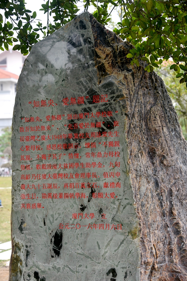 校歌石正面题有“知无央,爱无疆”六个大字,语出厦门大学校歌“致吾知于无央”、“充吾爱于无疆”,背面即为“知无央,爱无疆”题记。厦门大学创办伊始,校主陈嘉庚先生就将校训、办学理念和宗旨融入校歌。厦门大学校歌以其独特的个性,催人奋进的歌词,优美的旋律和雄伟的气势,激励着一代代厦大人自强不息。