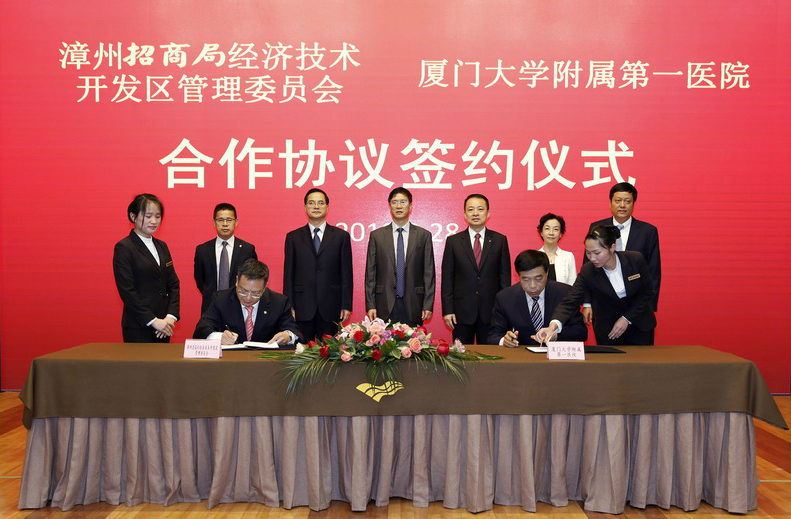3月28日下午,厦门大学附属第一医院与漳州招商局经济技术开发区管委会合作签约仪式在漳州开发区举行。漳州开发区党委书记、管委会主任丁勇、厦门大学附属第一医院副院长罗琪先后在仪式上致辞。漳州市副市长兰万安,厦门大学校长助理邱伟杰,漳州市卫计委党组书记、主任许鹃君,厦门大学漳州校区党工委书记、管委会主任林辉,漳州开发区管委会副主任刘永祥、肖洪光、漳州开发区管委会主任助理金彦云,厦门大学附属第一医院、漳州开发区管委会有关部门、漳州开发区第一医院负责人出席了仪式。漳州开发区党委副书记、管委会常务副主任赵卫朋主持仪式。