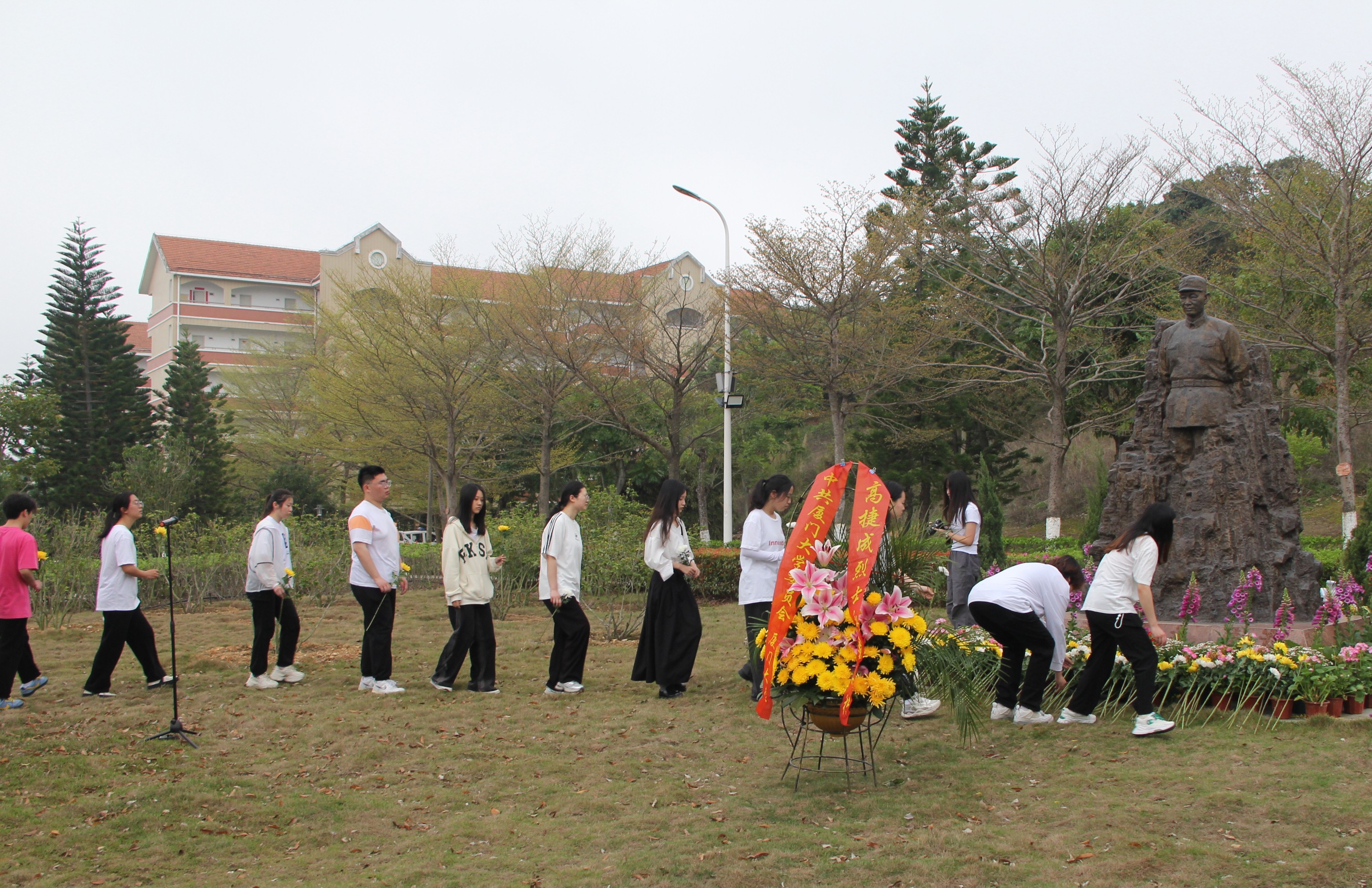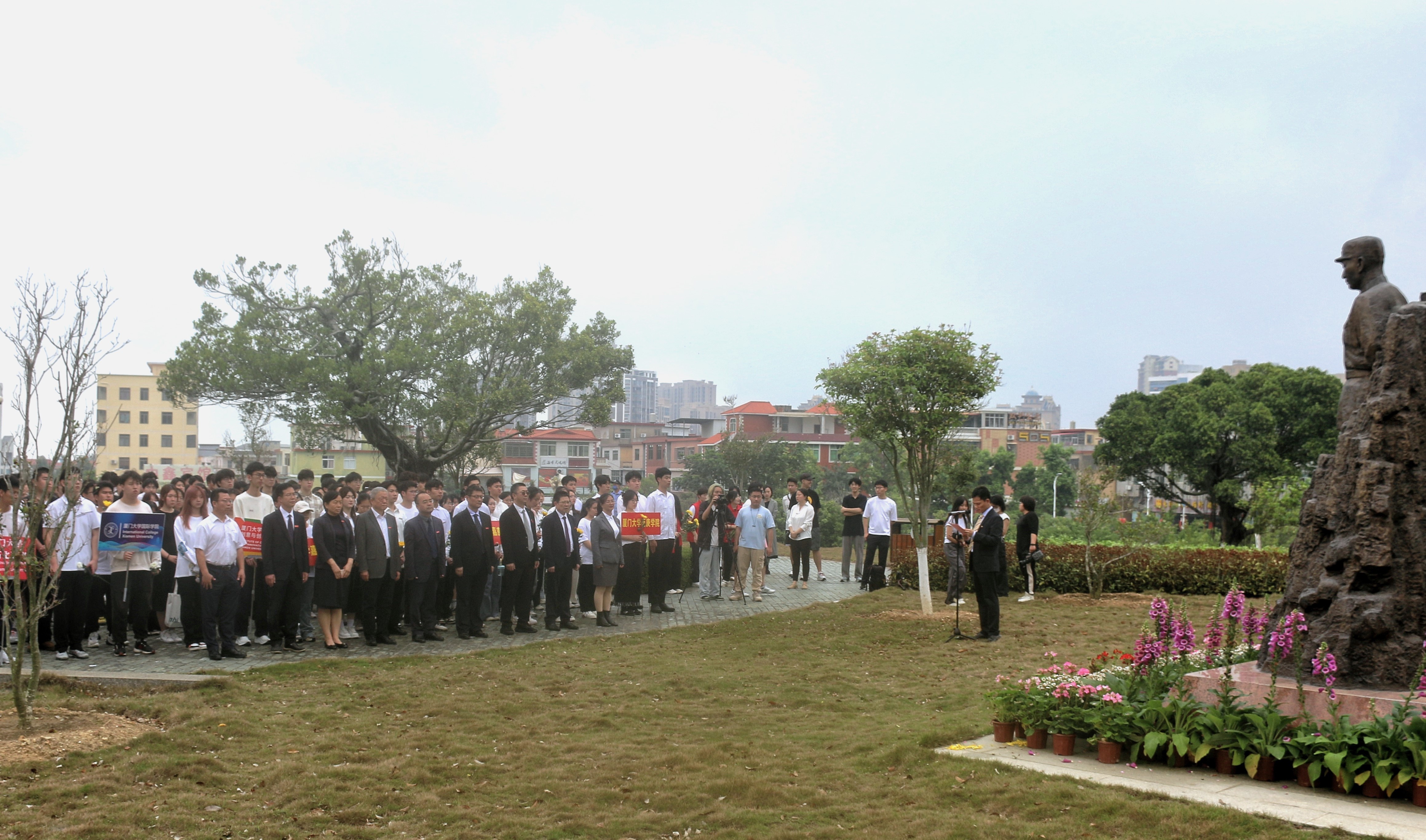时值清明,翠柏凝春。4月4日,校区组织各单位、附属中小学师生代表200余人,向陈嘉庚先生、高捷成烈士铜像敬献花篮,表达深切的缅怀和敬意。